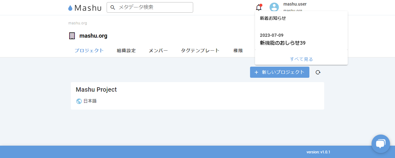 Mashuのヘッダーには、通知用のベルのアイコンがあります。新着のお知らせがある場合は赤いバッチがつきます。ベルのアイコンをクリックすると、新着のお知らせが表示されます。
