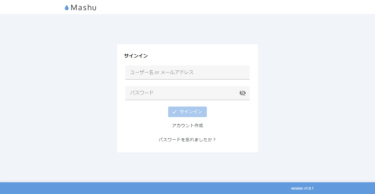 アカウントの確認画面では、「Mashu確認コード」メールで送られた確認コードを入力して、「アカウントの確認」ボタンを押してください。
