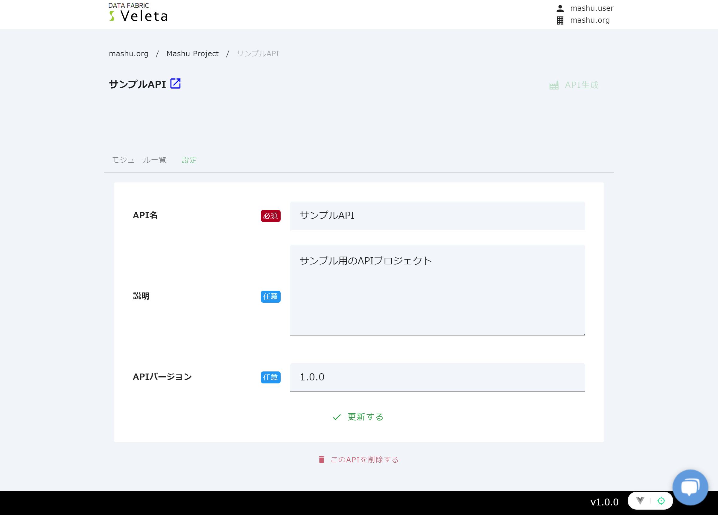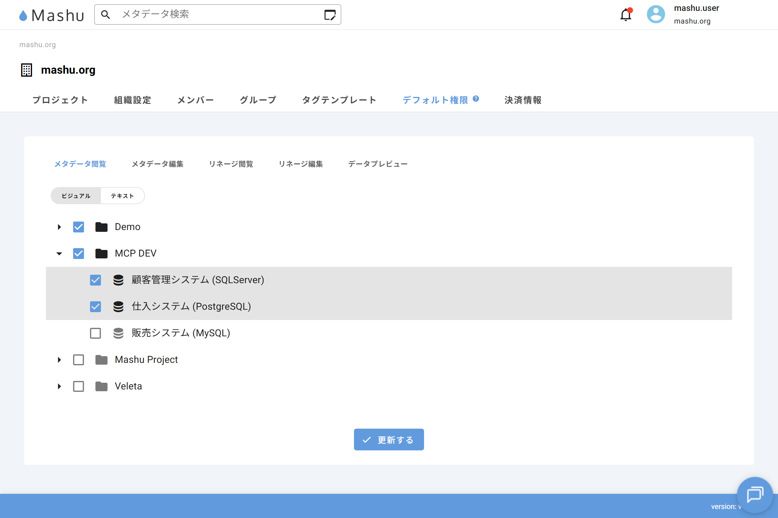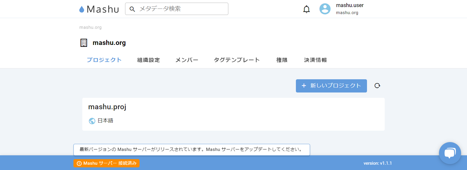 Mashuのデータ構造は、組織の下にプロジェクトがあり、プロジェクトの下にメタデータソースがあります。メタデータソースは、データを管理しているシステムの単位に作成します。
