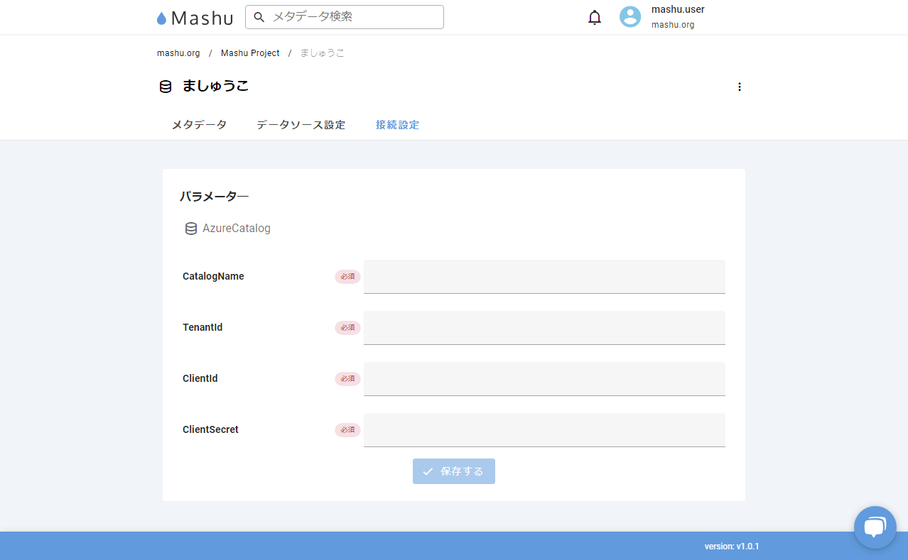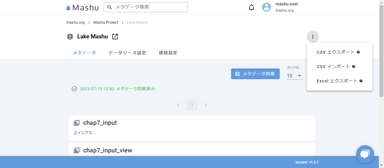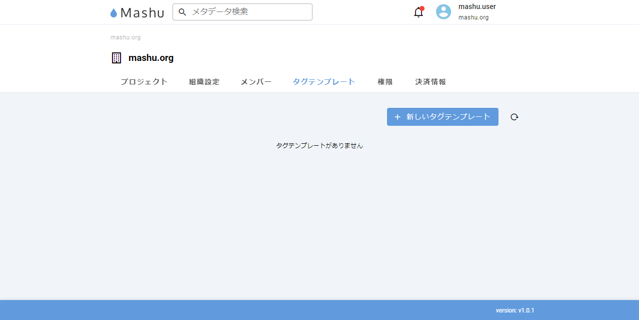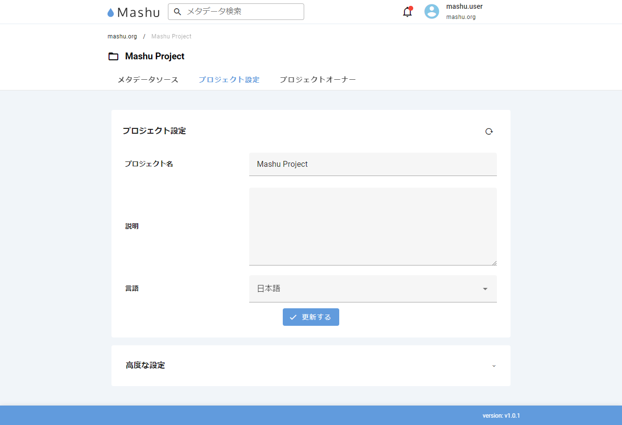 Mashuのデータ構造は、組織の下にプロジェクトがあり、プロジェクトの下にメタデータソースがあります。Mashuが管理するメータデータは、メタデータソースから抽出したものです。このタブでは、そのメタデ...