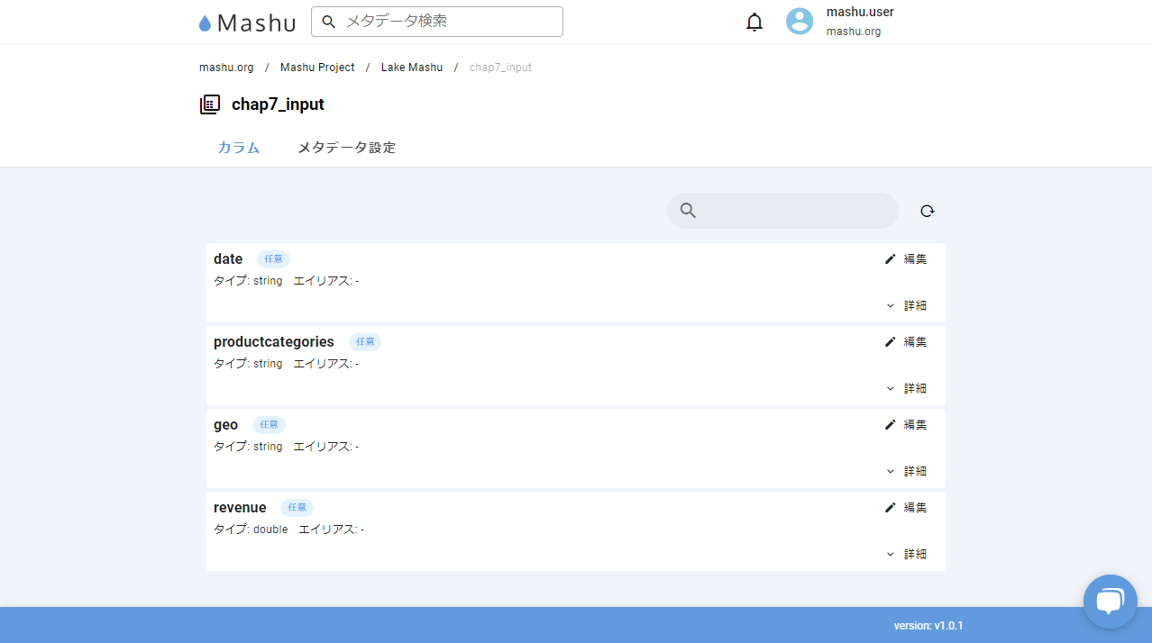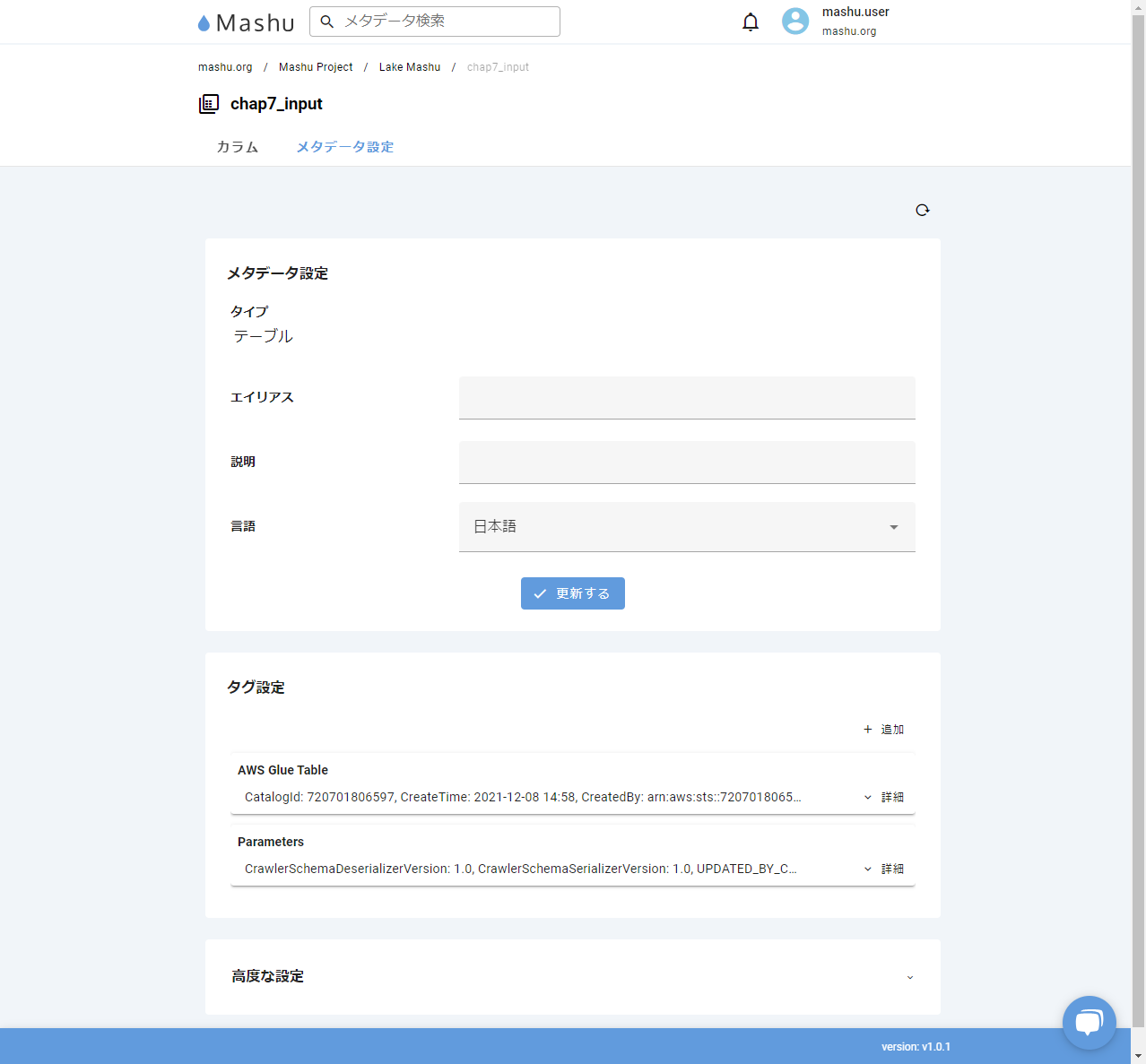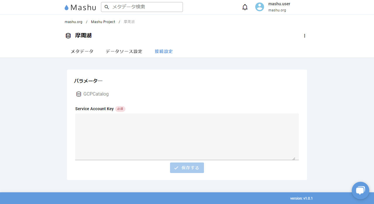 Mashuのデータ構造は、組織の下にプロジェクトがあり、プロジェクトの下にメタデータソースがあります。Mashuが管理するメータデータは、メタデータソースから抽出したものです。このタブでは、そのメタデ...