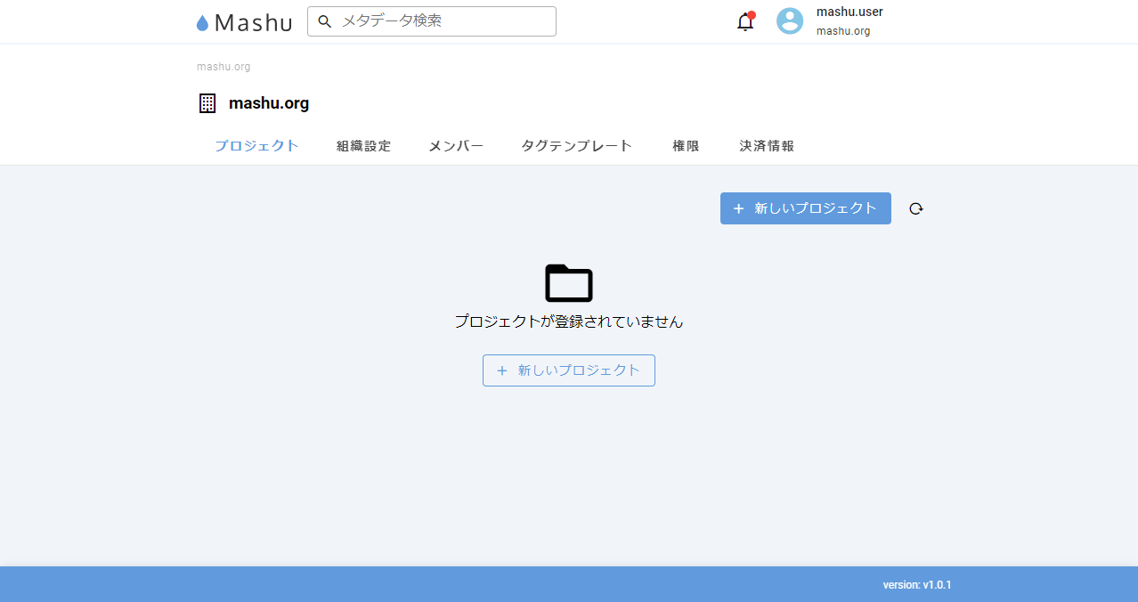 Mashuのデータ構造は、組織の下にプロジェクトがあり、プロジェクトの下にメタデータソースがあります。メタデータソースは、データを管理するシステムの単位に作ります。