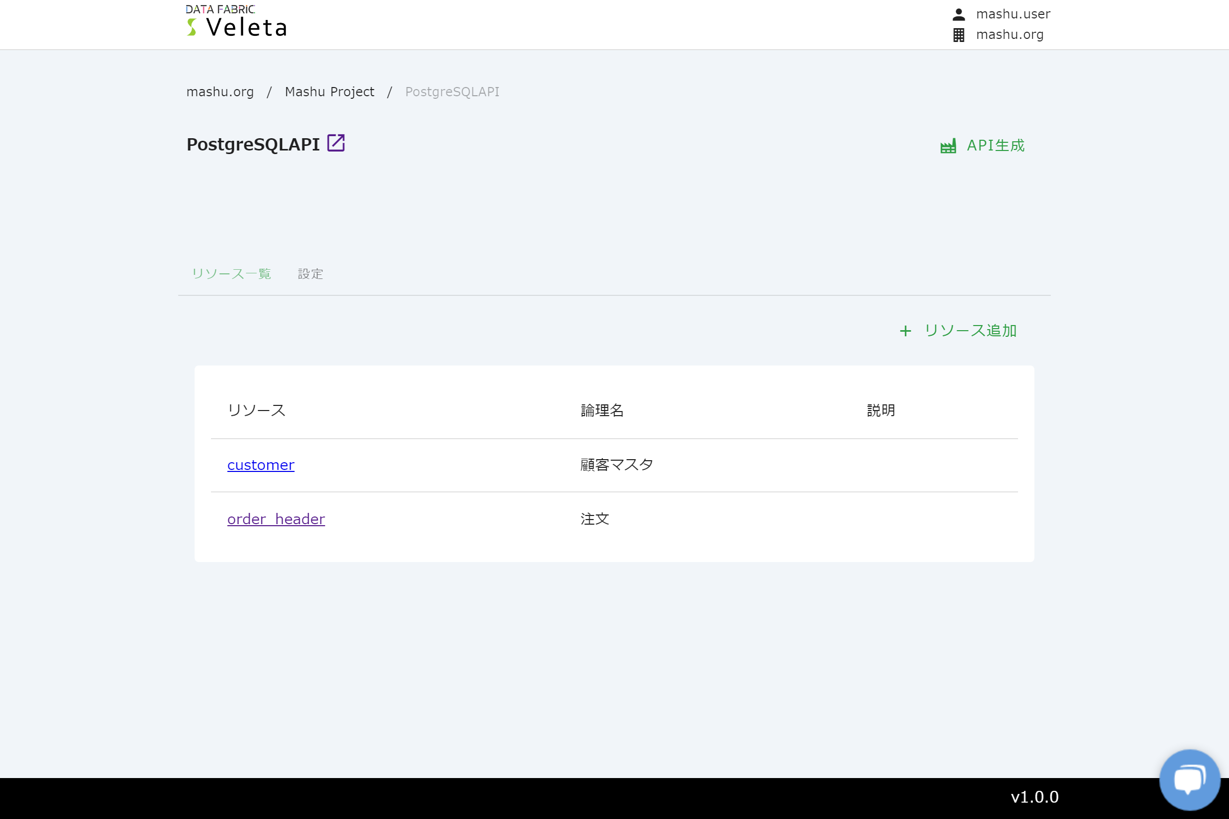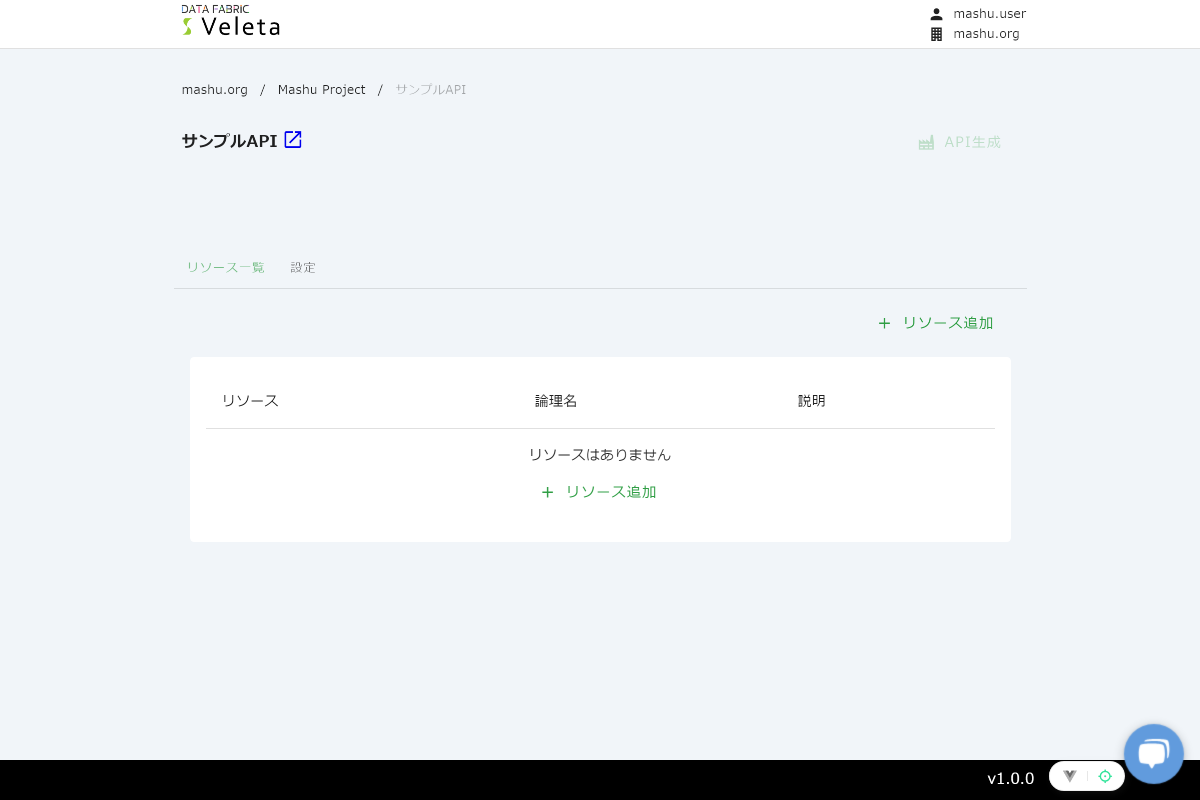 VeletaでAPIを生成するにはまずリソースを追加する必要があります。リソースはMashuのメタデータ(テーブル)と1対1の関係になっています。