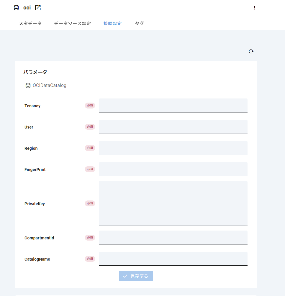 Olacle Cloud Infrastructure の Data Catalog に対するメタデータソースを作成するためには、メタデータソースを作成する際にタイプとして OCICatalogを選択...