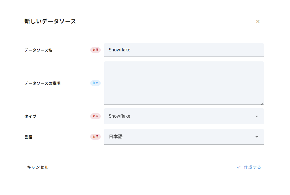 1. メタデータソースの作成 Snowflakeのメタデータを同期するために、タイプとして「Snowflake」を選択してデータソースを作成します。