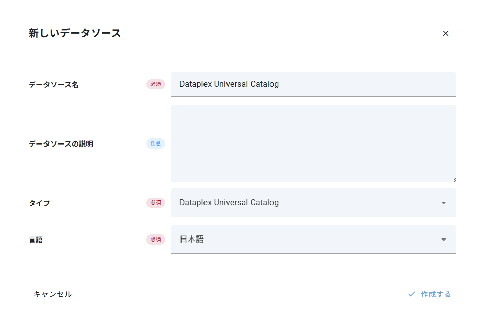 Google Cloud Platform の Data Catalog に対するメタデータソースを作成するためには、メタデータソースを作成する際にタイプとして GCPCatalogを選択する必要があ...