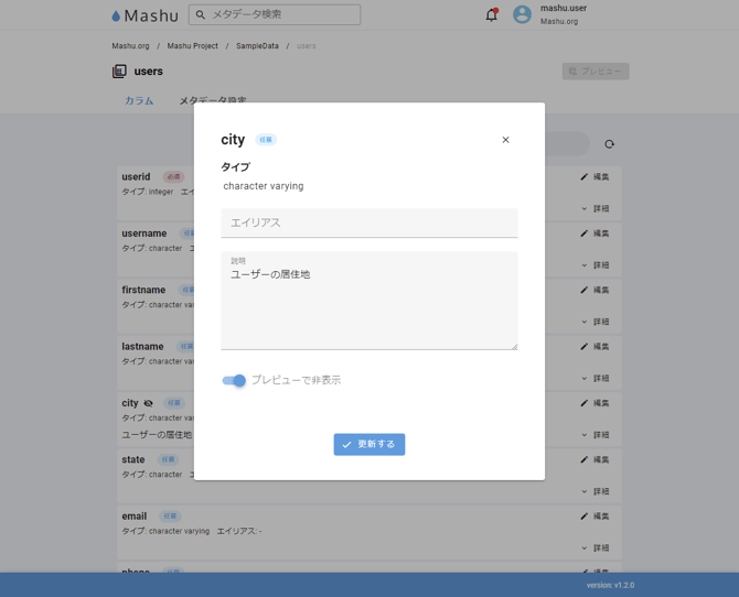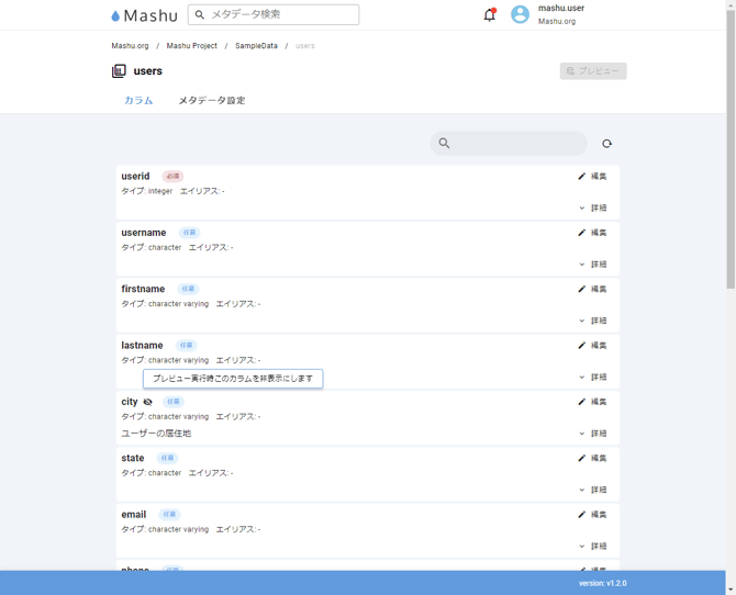 メタデータと関連するデータベースのデータの一部をプレビューして、メタデータ利用目的の参考にできます。プレビュー機能はメタデータ詳細画面の「プレビュー」ボタンから実行できます。