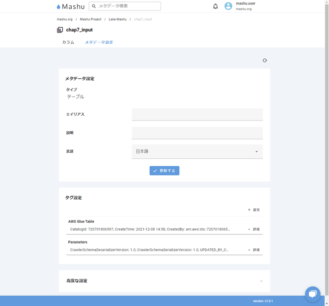 メタデータ画面のメタデータとは、データを管理しているシステム上で「データ」として管理されている単位、つまり、リレーショナルデータベースでいうと「テーブル」が該当します。