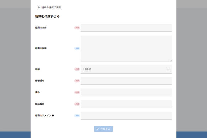 組織を作成する画面では、組織の名前、説明、この組織が所有するメタデータを記述する言語の初期値、請求書に記載される郵便番号、住所、電話番号を記載します。