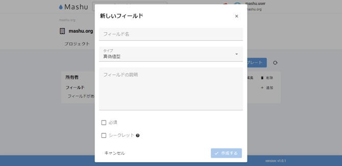 タグテンプレートは、タグのユーザー定義型、クラスや構造体のようにフィールドを定義することができます。フィールドの名前、型(タイプ)、説明、必須項目か否か、画面にそのまま値を表示してはいけないシークレットな項目か?を指定します。