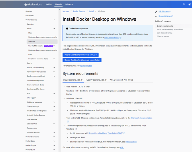 System requirements を確認し、[Docker Desktop for Windows -x86_64] をクリックしてインストーラーをダウンロードします。