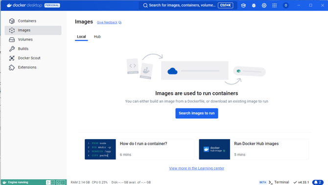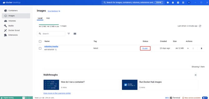 Docker Desktop の Images から Status が [In use] になっているので、ここクリックします。