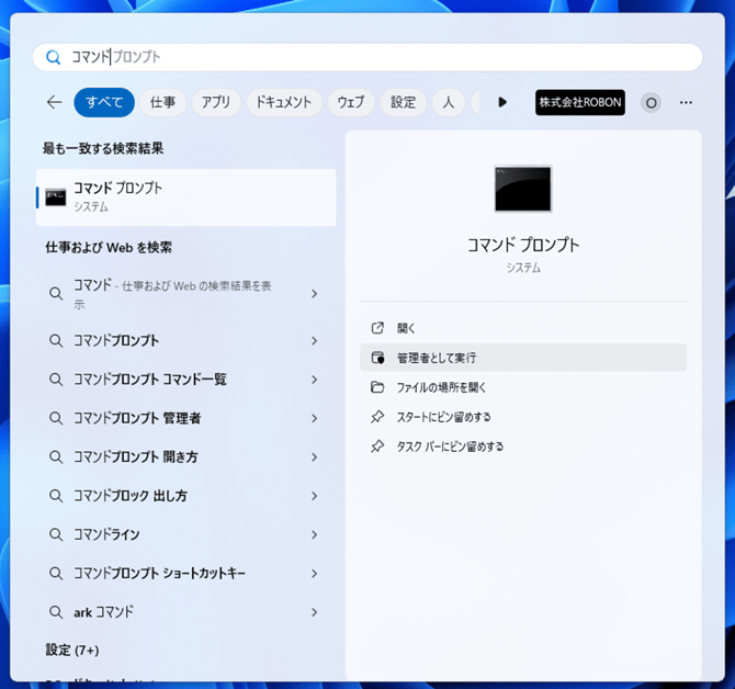 Windows 11 のスタートボタンから コマンドプロンプト を検索し、管理者権限で実行します。