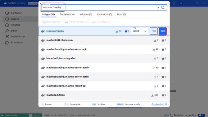 上部の検索スペースで [roboninc/mashu] を入力すると下記の画面になるので、[RUN] をクリックします。