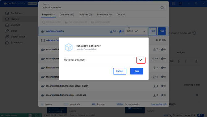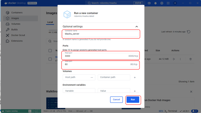 以下の画面が表示されれば完了です。Docker Desktop 上にイメージがPullされ、Mashu サーバーが 動作しています。