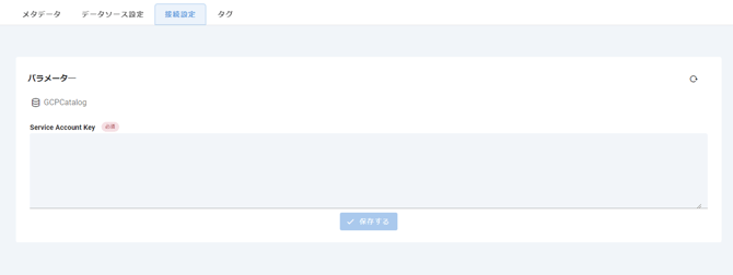 GCPのData Catalogとの連携には、GCPの認証情報が必要です。Mashuでは、GCPのサービスアカウントのキーを使用しています。この認証には、サービスアカウントのキーの内容が必要となります。サービスアカウントのキーのタイプをJSONにしてキーを作成してください。作成したキーを接続設定タブのService Account Keyテキストエリアに貼り付けてください。