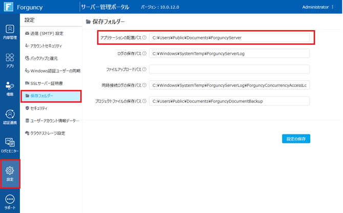 - 左側のメニューから [設定] を開き、次に [保存フォルダー] を選択します。