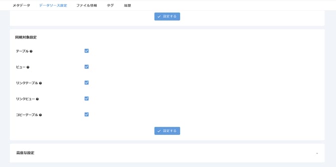 データソース画面の「データソース設定」タブで、同期するメタデータの種類を絞り込むためのテーブル種別を指定します。
