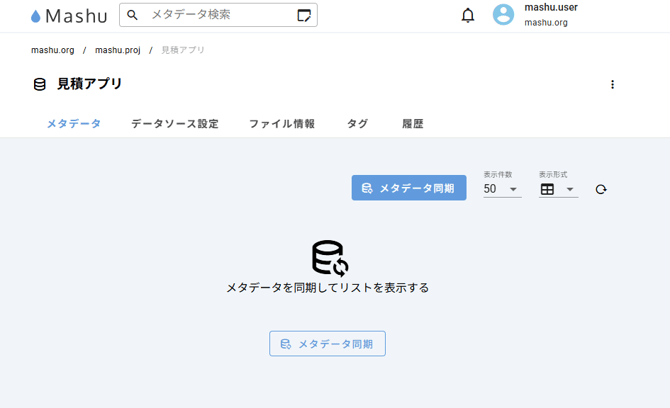 - Mashuで作成したデータソースの設定画面を開き、[メタデータ] タブを選択します。