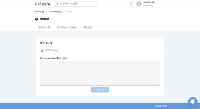 GCPのData Catalogとの連携には、GCPの認証情報が必要です。Mashuでは、GCPのサービスアカウントのキーを使用しています。この認証には、サービスアカウントのキーの内容が必要となります。