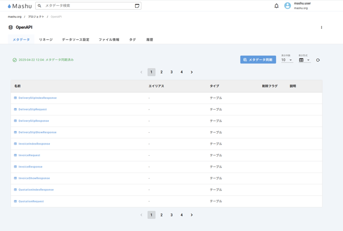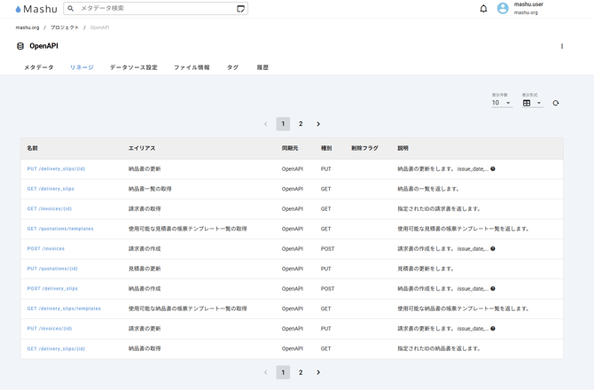 このページでは、OpenAPI仕様書から各Operation(エンドポイント)およびそのパスパラメータ・クエリパラメータ・リクエストボディ・レスポンスボディをメタデータとしてMashuに同期し、Webアプリ上でデータリネージとメタデータとして一元管理する機能について説明します。