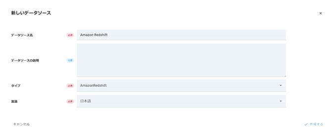 Redshiftのメタデータを同期するために、タイプとして「AmazonRedshift」を選択してデータソースを作成します。