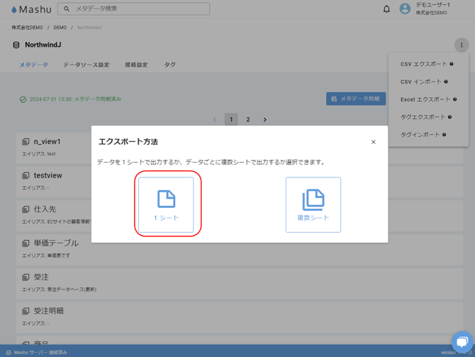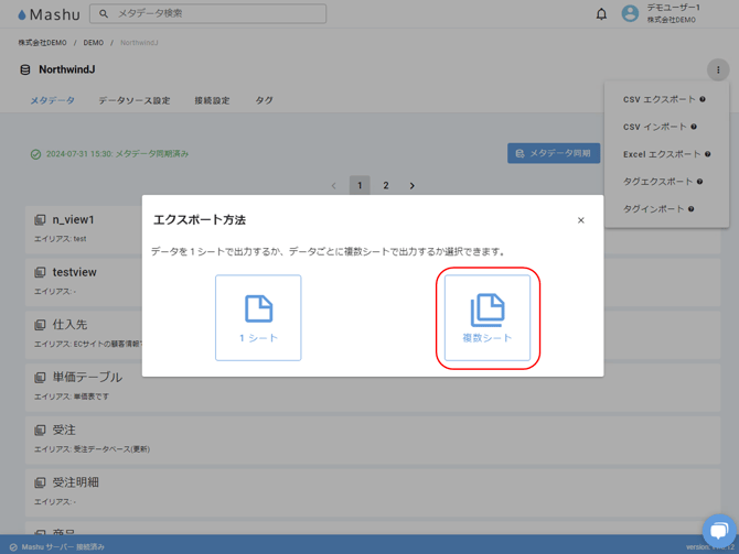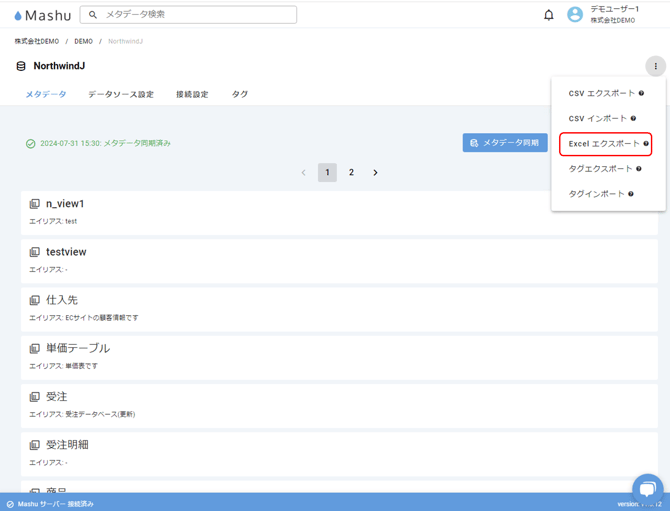 出力するメタデータから右上の三点リーダーを選択し、[Excel エクスポート] をクリックします。