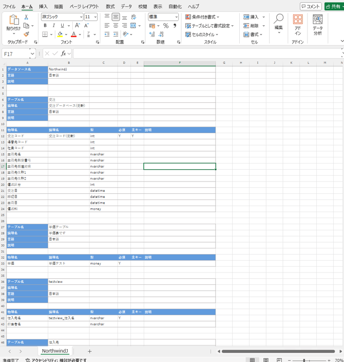 テーブルごとにシートを分けて情報を出力します。