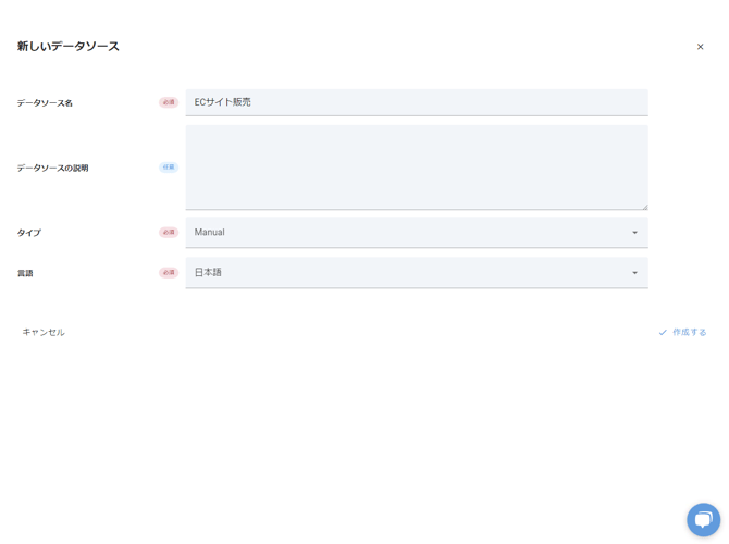 任意の[データソース名] を入力し、[タイプ]を [Manual] を選択します。[言語]を選択し、そして [作成] をクリックします。