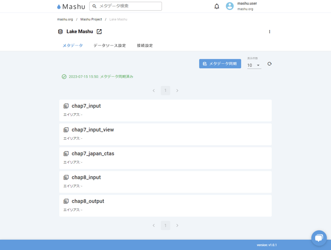 Mashuのデータ構造は、組織の下にプロジェクトがあり、プロジェクトの下にメタデータソースがあります。Mashuが管理するメータデータは、メタデータソースから抽出したものです。このタブでは、そのメタデータが一覧表示されます。