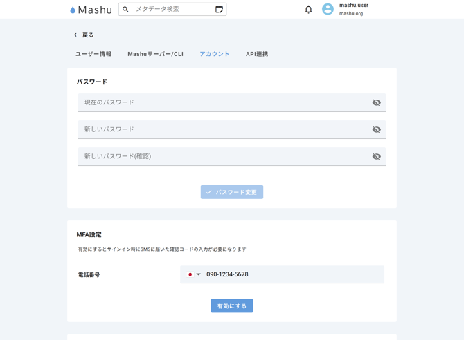 「アカウント」タブに移動したあと、「MFA設定」にショートメッセージ(SMS)を受信する電話番号を入力して「有効にする」ボタンを押すと設定が完了します。