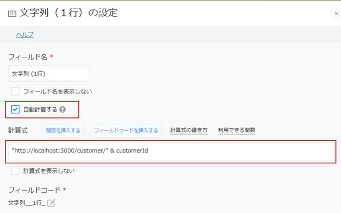 "http://localhost:3000/customer/" & customerIdのような Veleta WebアプリのURLとフォームの顧客IDを組み合わせた計算式を設定します。