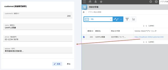 - アプリ更新後、問合せ管理アプリにデータを登録すると、Veleta Webアプリへのリンクが表示できます。これで問合せ管理アプリから顧客のデータを閲覧できるようになりました。