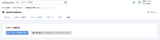 - 対象の選択: 補完を行いたいメタデータの詳細画面へ遷移し、[メタデータ補完] タブを開きます。